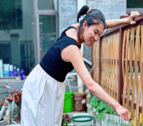 “种菜挺好玩,很有成就感”,焦安静在菜园里花了很多时间。只要在家,她一早给菜浇浇水,看看长势;中午做力量训练,也会在菜园进行。女儿恬恬从幼儿园放学,他们会一起摘菜。焦安静的日常还会陪女儿去公园跑步,在小区活动一下以及直播带货。